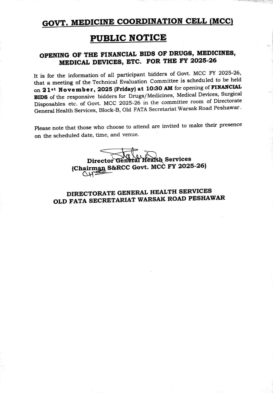 Public Notice regarding opening of financial bids of Govt. MCC FY 2025-26