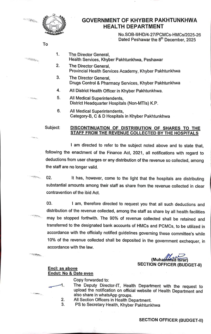 DISCONTINUATION OF DISTRIBUTION OF SHARES TO THE STAFF FROM THE REVENUE COLLECTED BY THE HOSPITALS